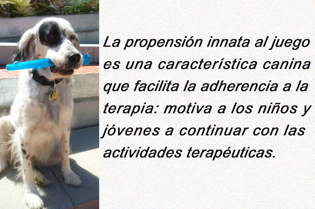 Por otra parte los perros ofrecen una perspectiva lúdica a la terapia, proporcionan beneficio físico ya que ayudan a la relajación, a veces simplemente observándolos, y por tanto facilitan la capacidad de autocontrol de los comportamientos agresivos.